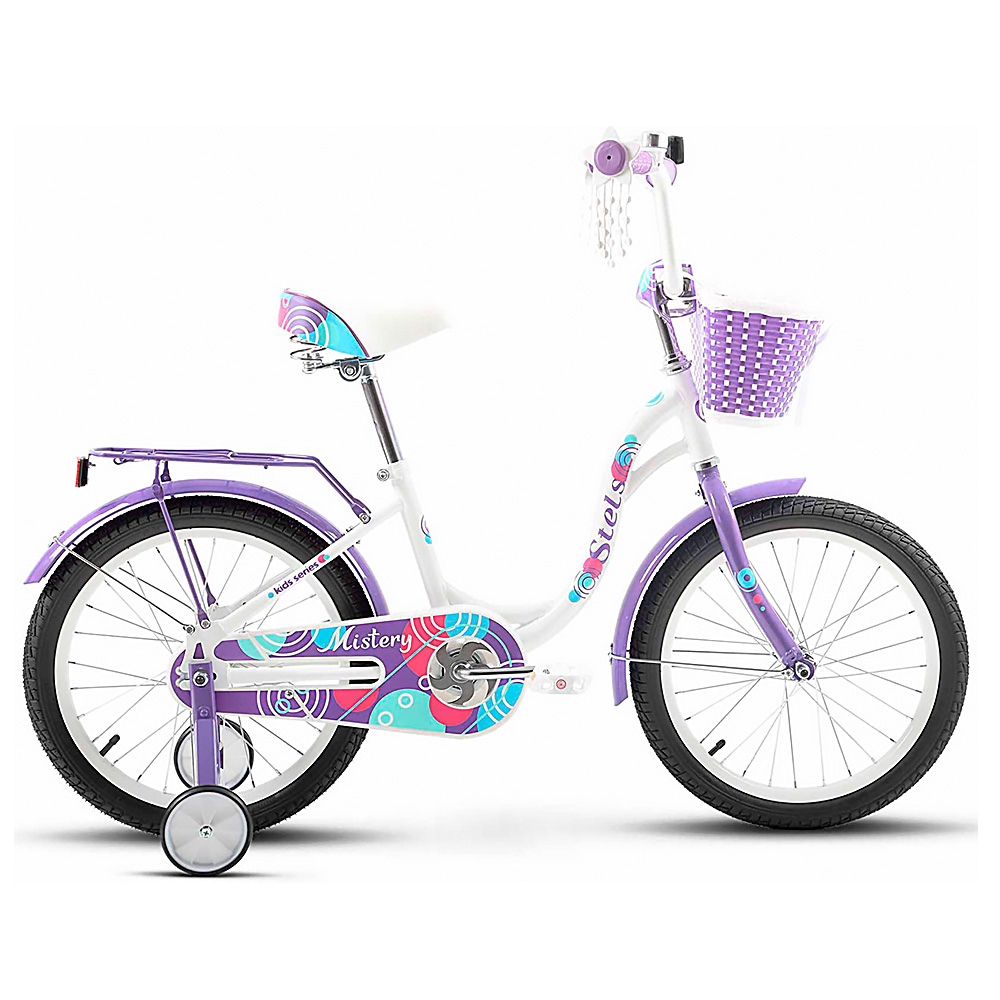 Как и большинство детских велосипедов этой возрастной категории, Стелс Мистери оснащен ножными тормозами, которые приводятся в действие путем нажатия на педали. Обода у этой модели одинарные. Из полезных аксессуаров имеются багажник и корзинка спереди - отличная возможность для маленькой велосипедистки прокатиться с ветерком не только самой, но и покатать свои игрушки.